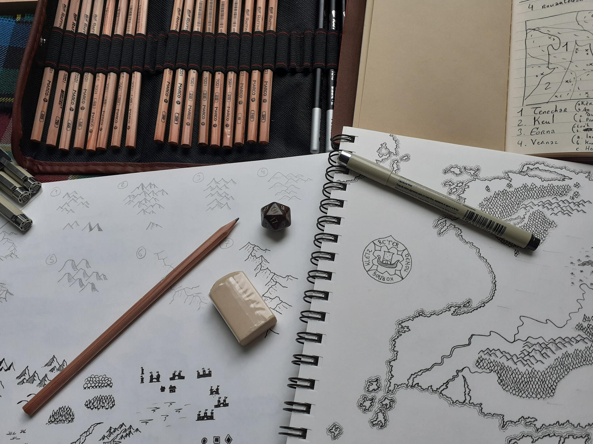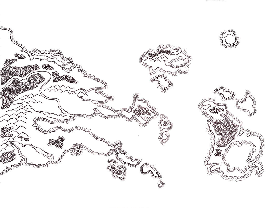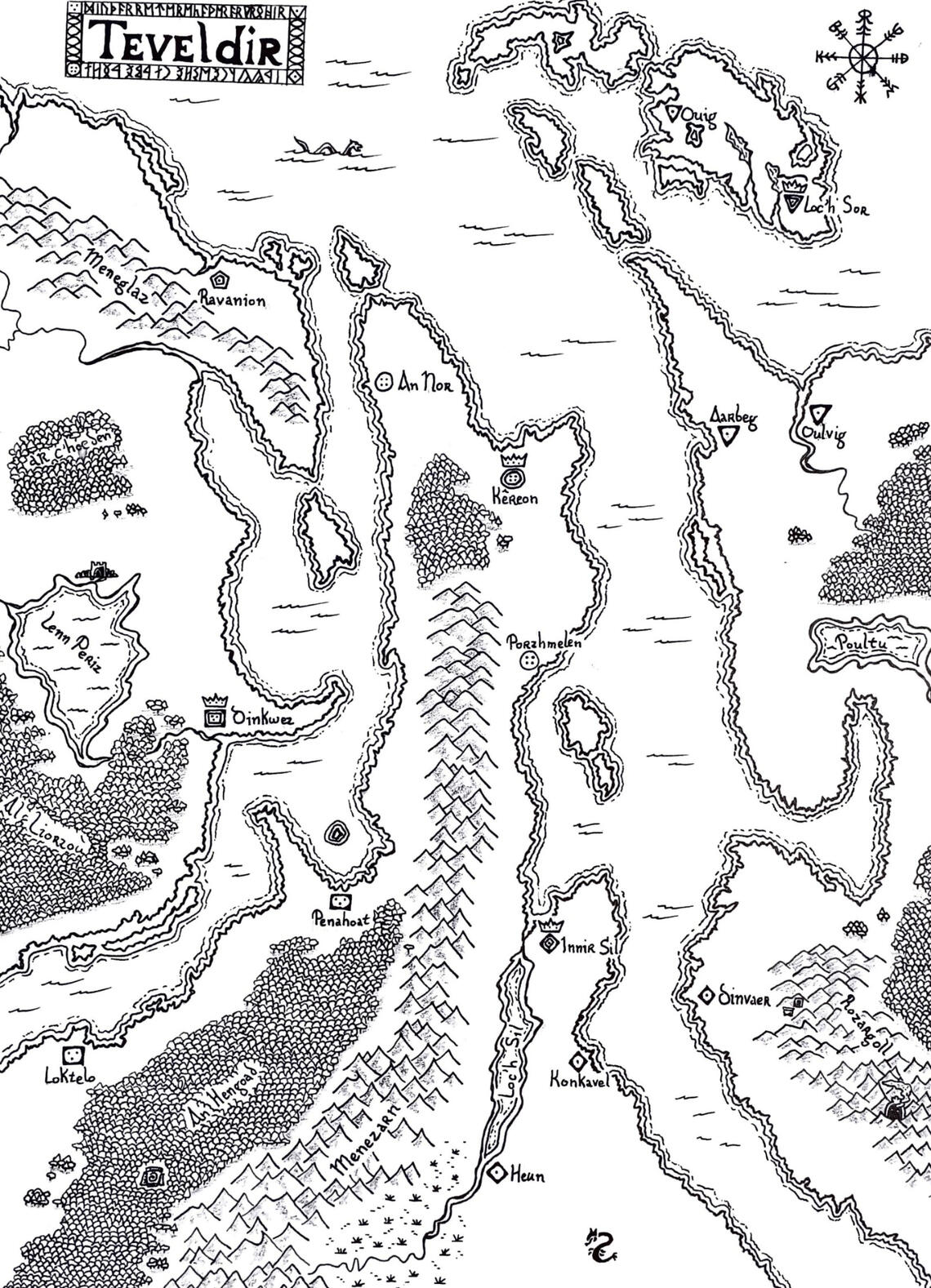 The mysteries of Teveldir are many. These lands are plagued by necromancers and warlocks, and beasts beyond imagination. Five lands rule most of the region: Tirada (main towns: Kêreon, An Nor, Porzhmelen); the Kingdom of the Isles (main towns: Loc'h Sor, Aarbeg, Oulvig, Ouig); the Kingdom of Keulada (main towns: Innir Sil, Konkavel, Heun, Dinvaer); Kelevig (main towns: Dinkwez, Loktelo, Penahoat); and the Duchy of Ravanion (a city-state centered around Ravanion). On top of these, there exists many dwarven and giant kingdoms, mostly in the woods and at the borders of the map.