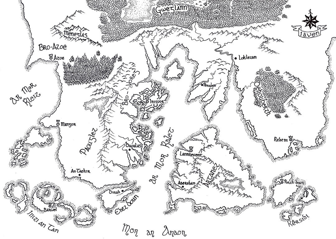 Iaven is a world full of magic and political intrigues. It is broken down in many lands: the Kingdom of Dehouberzh, the Kingdom of Artanez, the Duchy of Kêrsidi, the Moreg Confederation (Bro-Voreg), the Earldom of Enez Doun, the Duchy of Paouglez, the Kingdom of Azoe, the Lordship of Inizi an Tan, the Dwarven Kingdom of Meneglas, and Gweglann, the Land of Giants.
