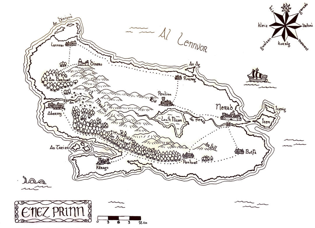 Enez Prinn is only a part of the kingdom of Tirenor, one of the main powers of a world known as An Glenn. This island lays in the middle of wide lake called the Lennvor. Enez Prinn is well-known for its university, which teaches spellcraft and history in the capital of Nerad. The land is rich, and the local mines are full of minerals. The main one lays near Penlinn, the economic centre of the island.