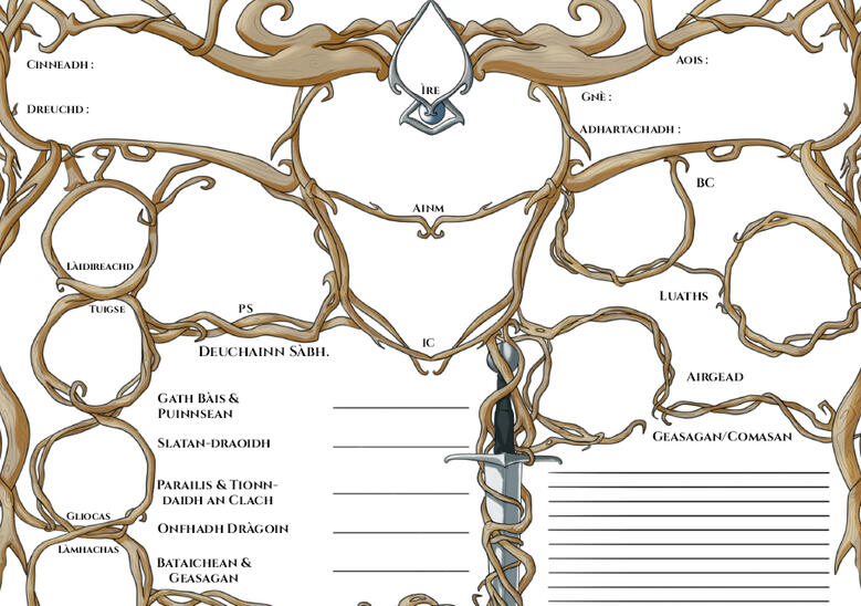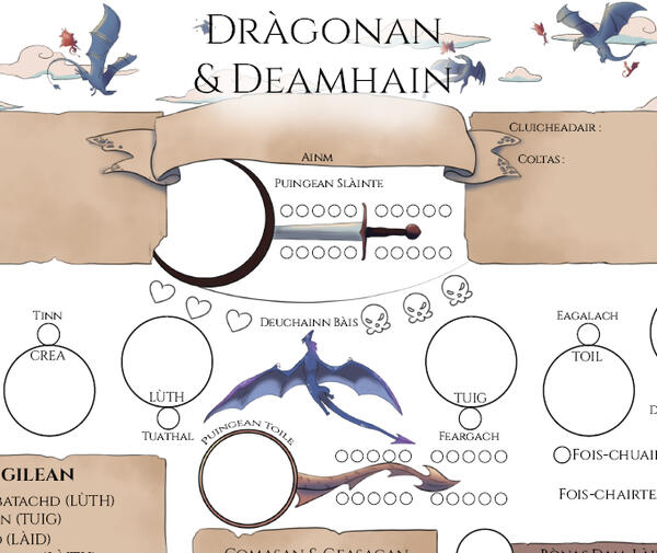 • D&D 5e Character Sheet in Scottish Gaelic. This is an oversetting of the character sheet of the 5th edition of one of the world's most famous TTRPG, made by a friend.
